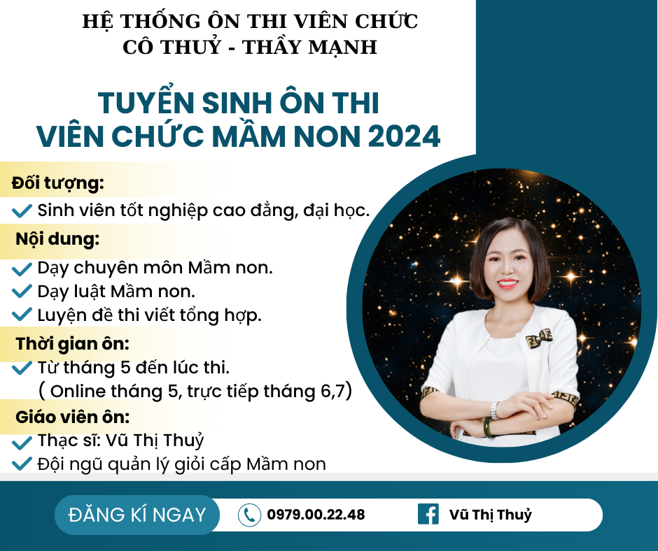Hệ thống ôn thi viên chức cô Thuỷ – thầy Mạnh thông báo tuyển sinh ôn thi viên chức mầm non năm 2024, dành cho sinh viên tốt nghiệp cao đẳng, mầm non, nhằm giúp các bạn nắm vững kiến thức chuyên môn và chuẩn bị tốt nhất cho kỳ thi tuyển viên chức sắp tới.